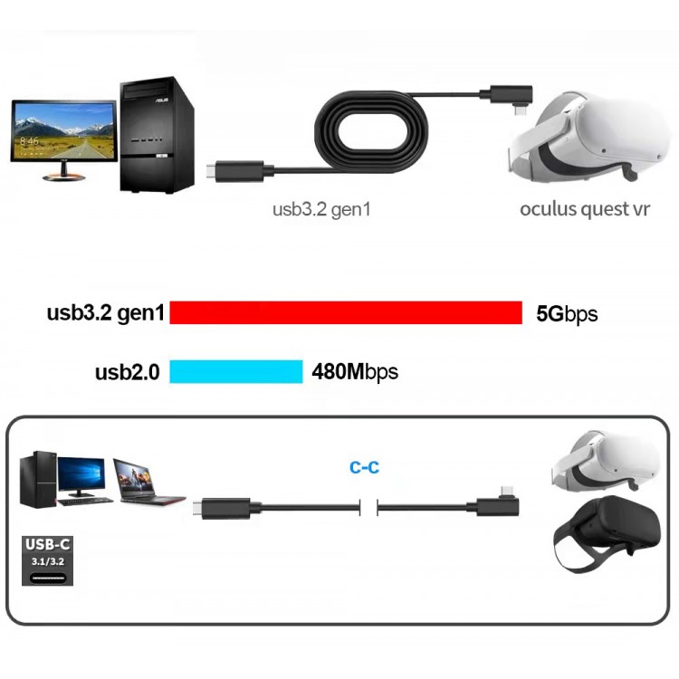 این کابل از USB 3.2 پشتیبانی میکند که سرعتی بسیار بالاتر از نسلهای قبلی ارائه میدهد. این ویژگی باعث کاهش تأخیر و افزایش کیفیت تصاویر در هدست میشود.